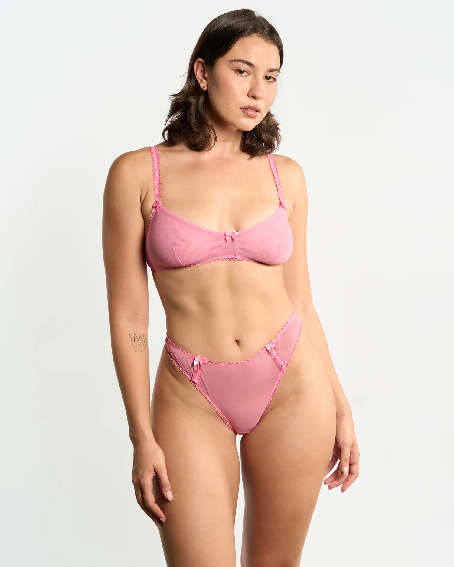 Introducing Dolly - a romantic fantasy in soft pink, designed for The Dream Suite. Crafted from comfortable stretch mesh with delicate lace detailing, Dolly captures the charm of vintage hotel evenings and the sweetness of dressing just for yourself. Light, feminine, and irresistibly pretty, this set blends playful softness with timeless allure.