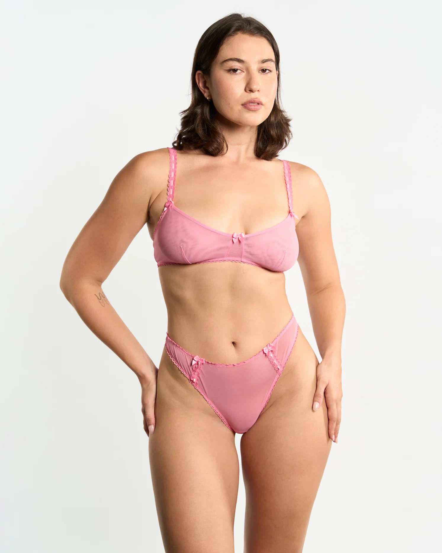 Introducing Dolly - a romantic fantasy in soft pink, designed for The Dream Suite. Crafted from comfortable stretch mesh with delicate lace detailing, Dolly captures the charm of vintage hotel evenings and the sweetness of dressing just for yourself. Light, feminine, and irresistibly pretty, this set blends playful softness with timeless allure.