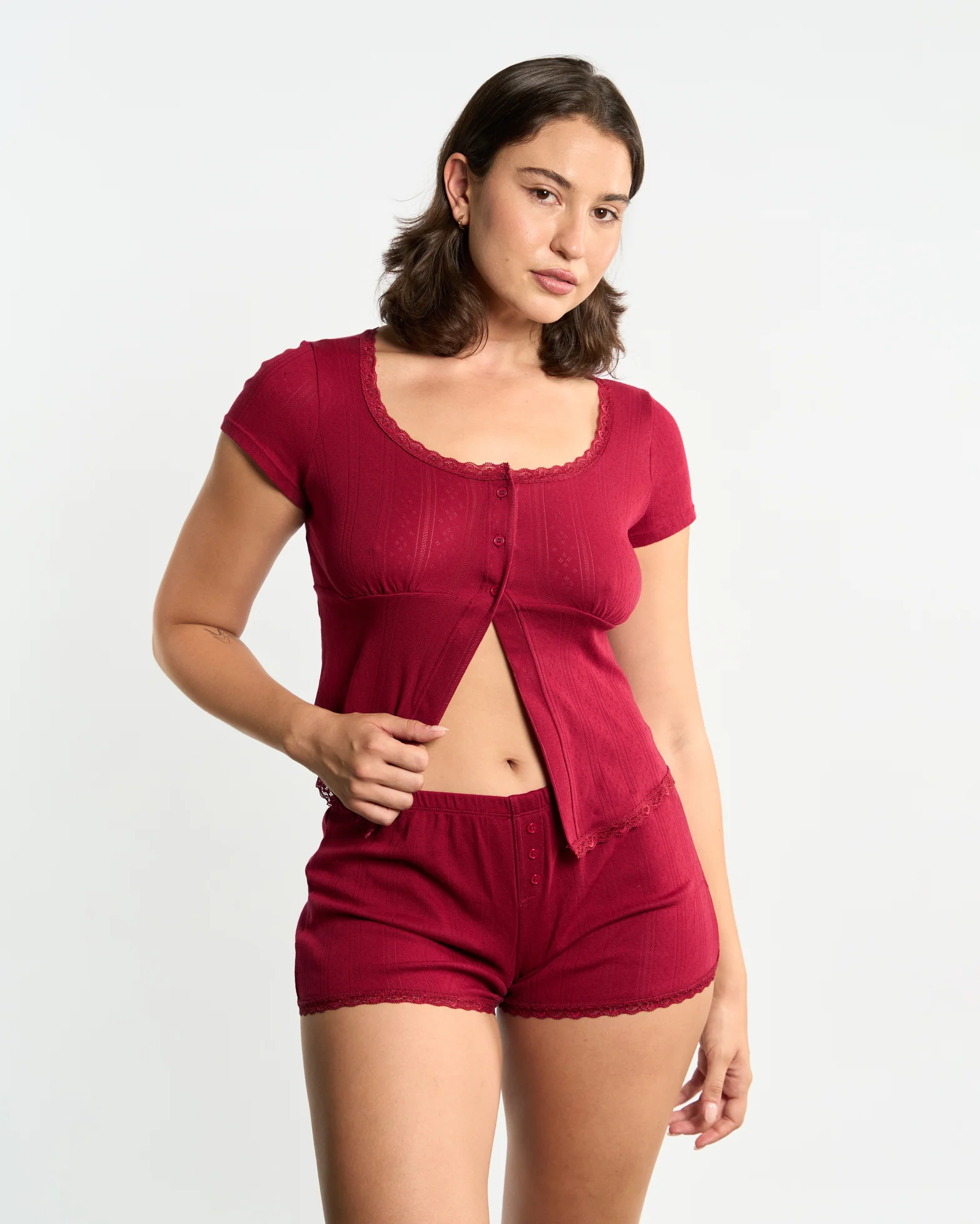 Introducing Willow - the softer side of Noctéra. Crafted from rich Merlot cotton pointelle, this pyjama set balances ease with quiet allure. The Short-Sleeve Shirt features delicate lace detailing and a button-down front, paired with mid-rise Shorts that fit smoothly against the body.